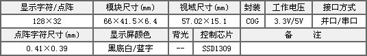 - 描述:顯示點陣:128X32,品牌:金鵬 ,模塊尺寸:66X41.5X6.4 視域尺寸:57.02X15.1 控制IC:SSD1309 封裝COG 串口/并口,工作電壓3.3V(2.7-3.5),工作溫度-40至70
