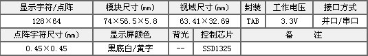 - 描述:顯示點陣:128X64,品牌:金鵬 ,模塊尺寸:74X56.5X5.8 視域尺寸:63.41X32.69 控制IC:SSD1325 封裝TAB 串口/并口,工作電壓3.3V(2.7-3.5),工作溫度-35至85