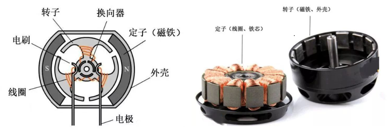 圖 1-2 左側(cè)為有刷電機、右側(cè)為無刷電機(圖片來自網(wǎng)絡(luò))