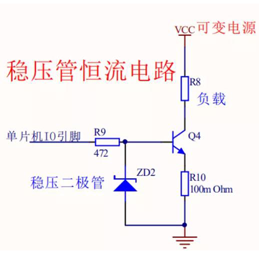 穩(wěn)壓二極管的恒流電路中,三極管Q4的基級電壓被限定在穩(wěn)壓二極管工作的穩(wěn)定電壓Uzd下,因此R10電阻的電壓等于Uzd減去三極管基級與發(fā)射級的導(dǎo)通壓降0.7V,即U=Uzd-0.7保持恒定不變,所以流過R10電阻的電流在VCC電源即使可變的條件下也是固定不變,也就是R8負(fù)載的電流保持不變,達(dá)到恒流的效果。