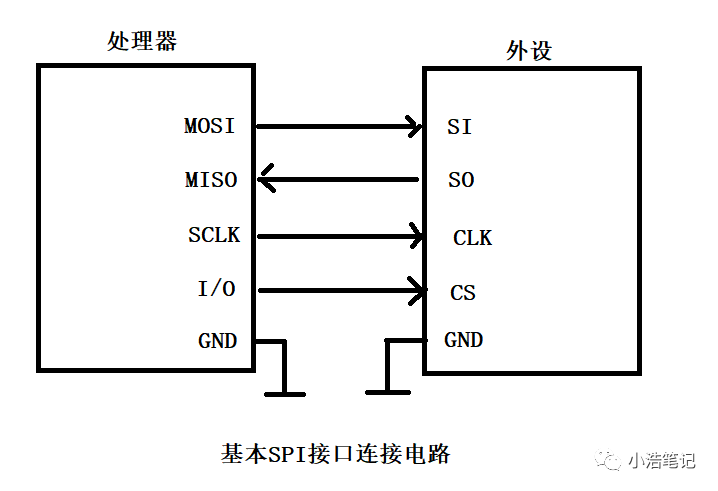 SPI主要使用四個信號:主機輸出/從機輸入(MOSI)、主機輸入/從機輸出(MISO)、串行SCLK或SCK、外設芯片(CS)。有些處理器有SPI接口專用的芯片選擇,稱為從機選擇SS。