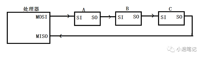 其他外設只需要一個單字節(jié)(比如一個發(fā)給A/D轉(zhuǎn)換器的命令),有些甚至還支持菊花鏈連接,菊花鏈連接三臺SPI設備,如下圖: