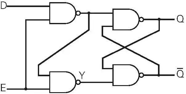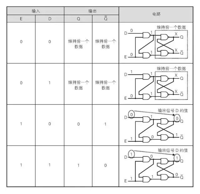 (2)D鎖存器(Data Latch,D-Latch,數(shù)據(jù)鎖存器)由4個(gè)NAND組成,輸入信號(hào)有D(DATA)和E(ENABLE),輸出信號(hào)有Q和/Q。工作邏輯:E 為 0 時(shí)保持前一個(gè)數(shù)據(jù),E 為 1 時(shí)將輸入 D 的數(shù)據(jù)輸出到 Q。E為1時(shí)輸入的 D 直接通過(guò) Q 輸出。D鎖存器構(gòu)成以及電路組成如下: