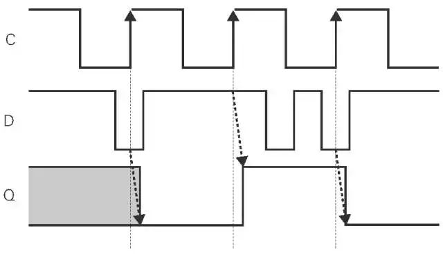 工作邏輯:當(dāng) D 觸 發(fā)器的 C 為 0 時(shí),前端 D 鎖存器輸出信號(hào) D 的值,后端 D 鎖存器保持之前的數(shù)據(jù)。當(dāng) C 為 1 時(shí),前端 D 鎖存器保持之前的數(shù)據(jù),后端 D 鎖存器將前端 D 鎖存器保持的數(shù)據(jù)直接通過(guò) Q 輸出。