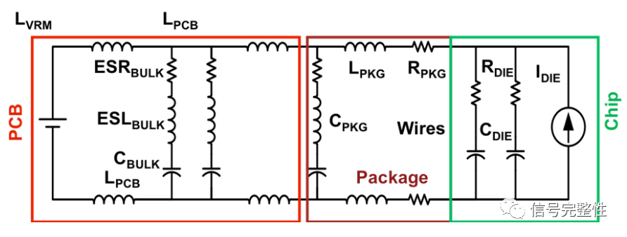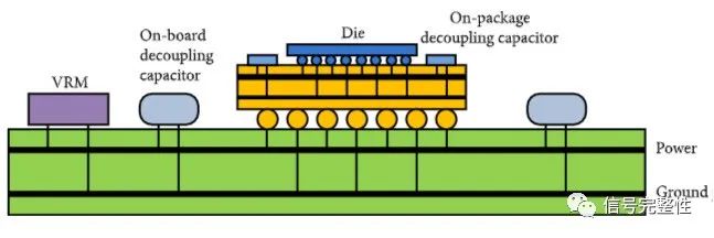 另外,引腳及焊盤本身也會(huì)有寄生電感存在,瞬態(tài)電流流經(jīng)此路徑必然產(chǎn)生壓降,因此負(fù)載芯片電源引腳處的電壓會(huì)隨著瞬態(tài)電流的變化而波動(dòng),這就是阻抗產(chǎn)生的電源噪聲。在電源路徑表現(xiàn)為負(fù)載芯片電源引腳處的電壓軌道塌陷,在地路徑表現(xiàn)為負(fù)載芯片地引腳處的電位和參考地電位不同。