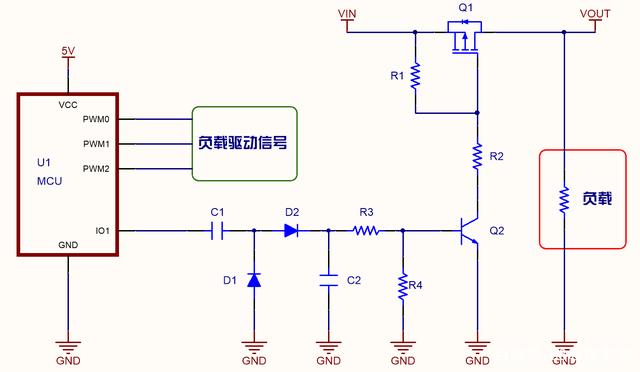 首先,最大的問(wèn)題是單片機(jī)失效后,IO端口狀態(tài)無(wú)法預(yù)料,只能切斷負(fù)載供電,所以只要能檢測(cè)到MCU是否正常工作,然后去控制負(fù)載供電開(kāi)關(guān)就可以避免上述問(wèn)題了。 順著這個(gè)思路,我們可以讓單片機(jī)一個(gè)IO口一直輸出50%占空比PWM信號(hào),用一個(gè)電容進(jìn)行隔離,當(dāng)正常工作時(shí)PWM信號(hào)可以通過(guò)電容,經(jīng)過(guò)整流濾波驅(qū)動(dòng)MOS管導(dǎo)通,當(dāng)死機(jī)后就沒(méi)有PWM信號(hào)輸出了,此時(shí)不管IO口是持續(xù)的高還是低電平,經(jīng)過(guò)電容后級(jí)都沒(méi)有電壓了,此時(shí)MOS管截止負(fù)載供電被關(guān)斷,這樣就有效保護(hù)了負(fù)載。