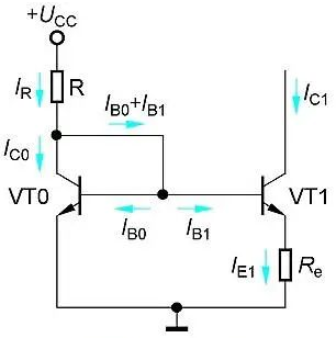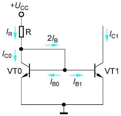 如下圖所示為鏡像恒流源電路,它由兩只特性完全相同的管子VT0和VT1構(gòu)成,由于VT0管的c、b極連接,因此UCE0=UBE0,即VT0處于放大狀態(tài),集電極電流IC0=β0*IB0。另外,管子VT0和VT1的b-e分別連接,所以它們的基極電流IB0=IB1=IB。設電流放大系數(shù)β0=β1=β,則兩管集電極電流IC0=IC1=IC=β*IB?梢,由于電路的這種特殊接法,使兩管集電極IC1和IC0呈鏡像關系,故稱此電路為鏡像恒流源(IR為基準電流,IC1為輸出電流)。