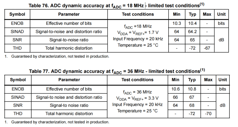 在使用內(nèi)置ADC的時(shí)候,我們要注意datasheet中相關(guān)的內(nèi)容,比如下面這個(gè)表里的表示ADC動(dòng)態(tài)性能參數(shù),ENOB代表的是有效位數(shù),SIAND信號(hào)與噪聲失真比。